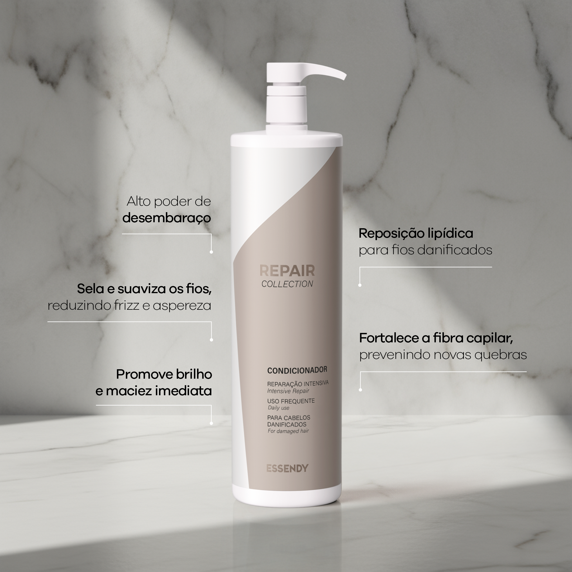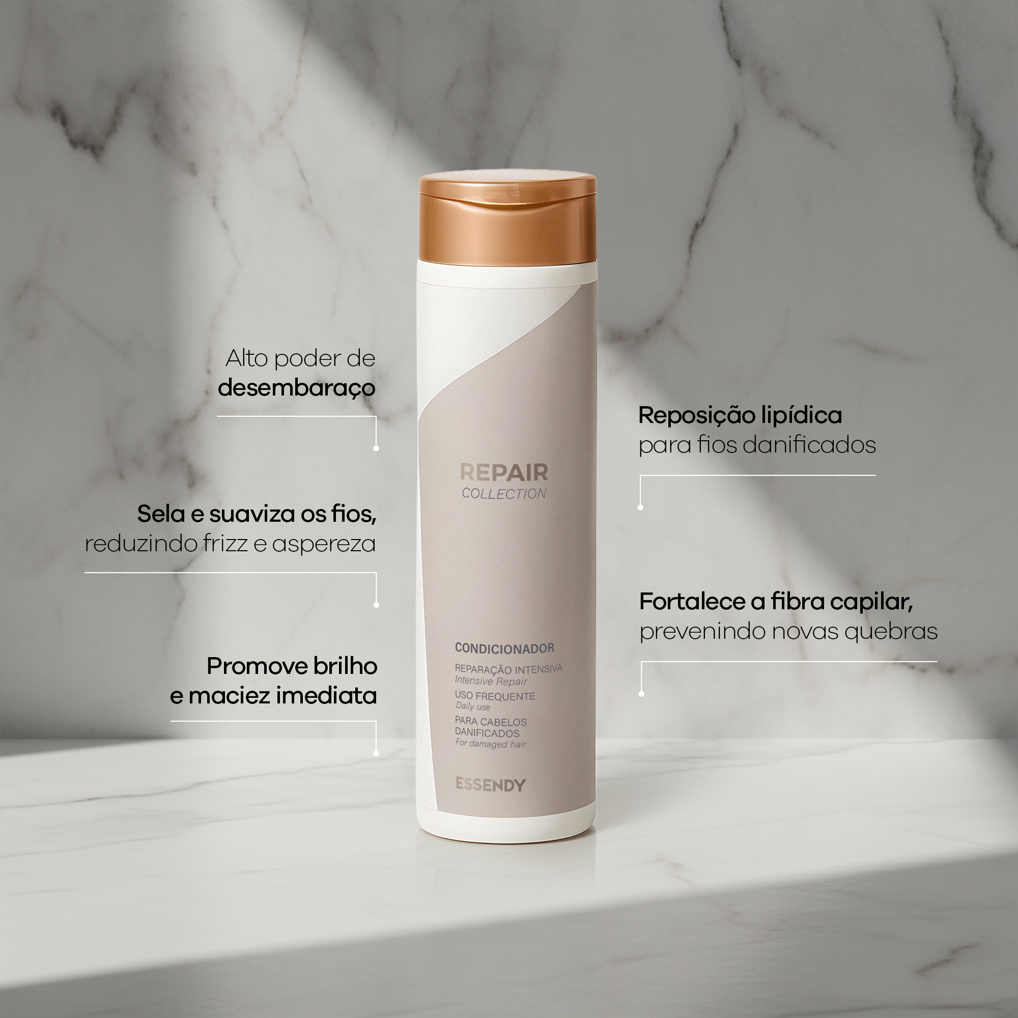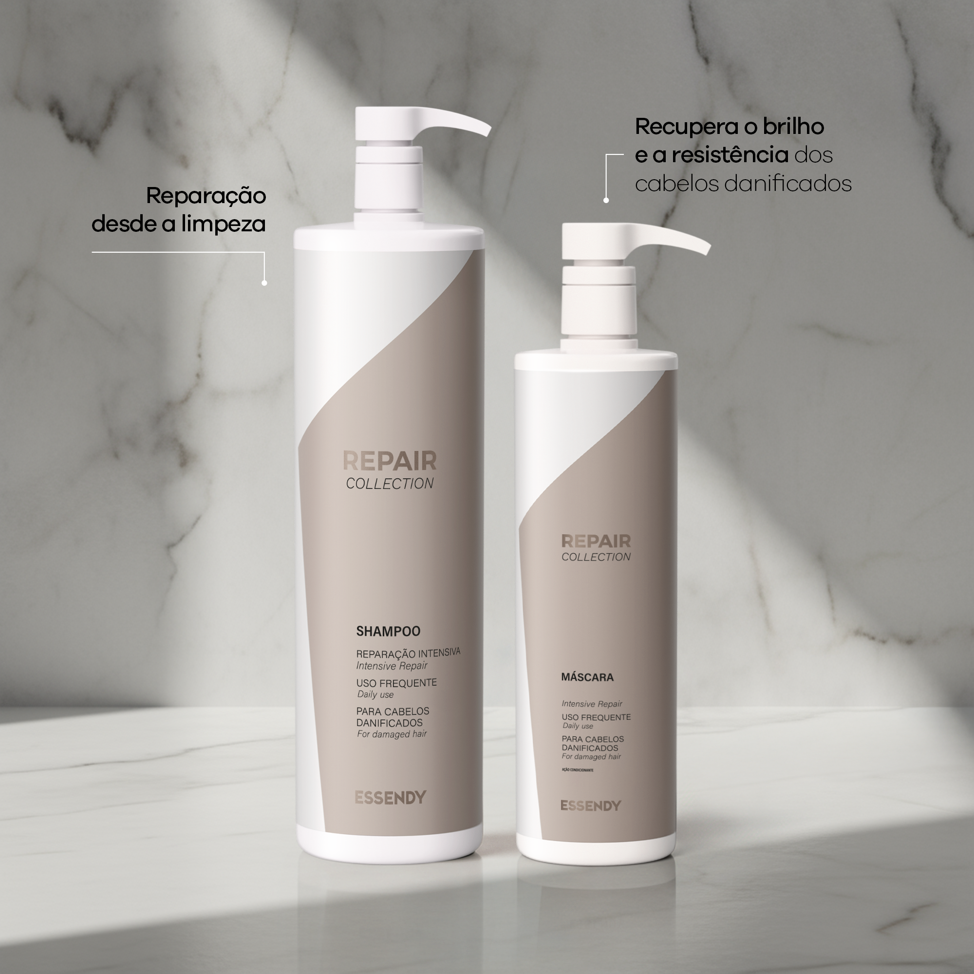 {"type":"root","children":[{"type":"paragraph","children":[{"type":"text","value":"reparação profunda, fortalecimento e proteção para cabelos mais resistentes, alinhados e radiantes!","bold":true}]},{"type":"paragraph","children":[{"type":"text","value":"O Shampoo Repair Collection da Essendy foi desenvolvido para cabelos danificados, quebradiços e fragilizados, proporcionando limpeza suave sem ressecar e preparando os fios para um tratamento reparador completo."}]}]}