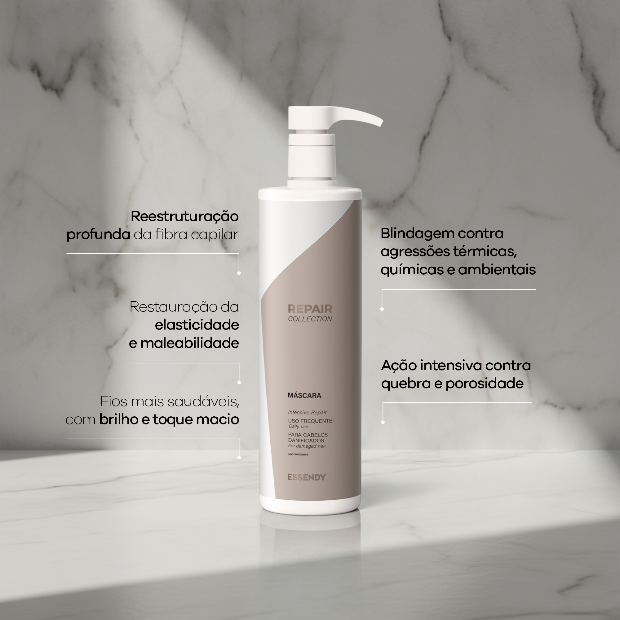 {"type":"root","children":[{"type":"paragraph","children":[{"type":"text","value":"reparação profunda, fortalecimento e proteção para cabelos mais resistentes, alinhados e radiantes!","bold":true}]},{"type":"paragraph","children":[{"type":"text","value":"A Máscara Repair Collection Essendy é um tratamento intensivo para cabelos danificados, quebradiços e ressecados , proporcionando hidratação profunda, hidratação intensa e proteção contra novos danos. Ideal para restaurar a saúde dos cabelos, proporcionando brilho e proteção."}]}]}