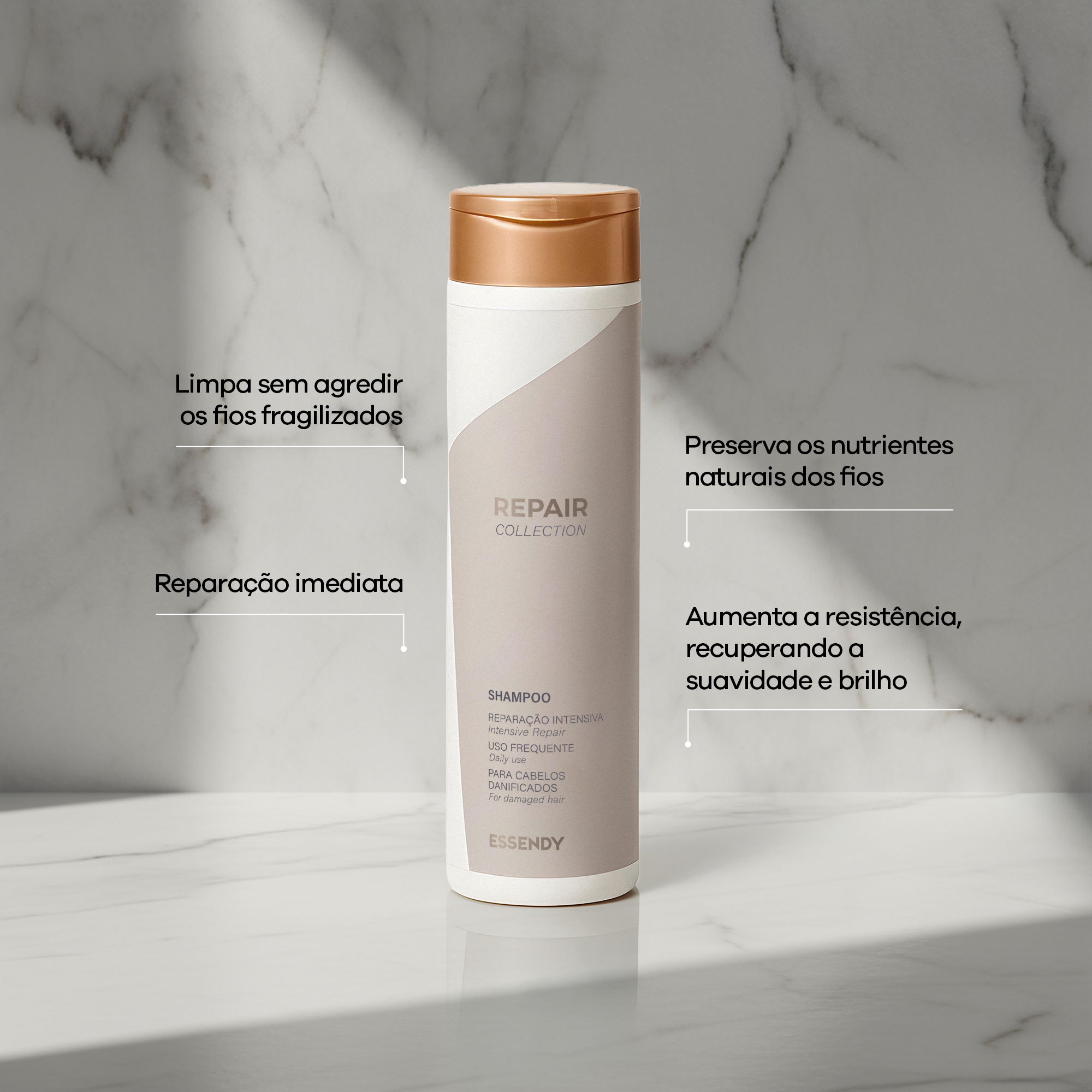 {"type":"root","children":[{"type":"paragraph","children":[{"type":"text","value":"reparação profunda, fortalecimento e proteção para cabelos mais resistentes, alinhados e radiantes!","bold":true}]},{"type":"paragraph","children":[{"type":"text","value":"O Shampoo Repair Collection da Essendy foi desenvolvido para cabelos danificados, quebradiços e fragilizados, proporcionando limpeza suave sem ressecar e preparando os fios para um tratamento reparador completo."}]}]}